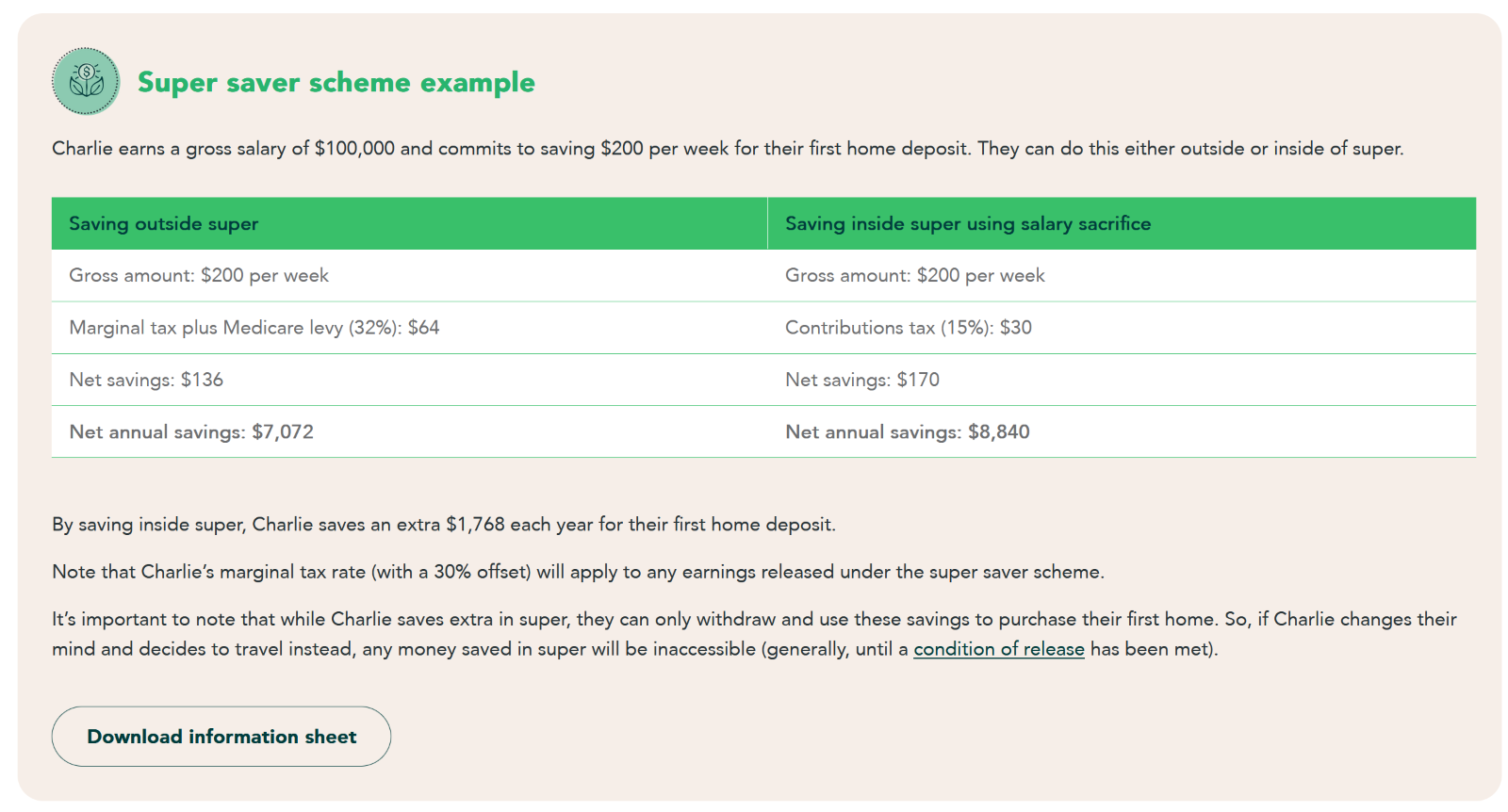Example savings calculations are referenced from NGS Super's First Home Super Saver Scheme Guide.
